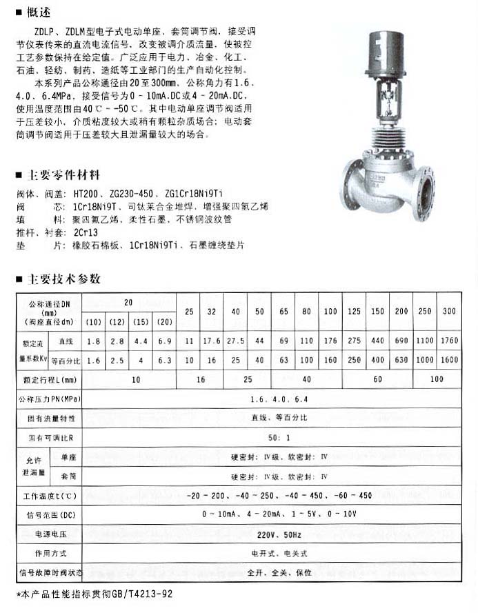 本系列產(chǎn)品公稱通徑由20至300mm.公稱角力有1.6、4.0、6.4MPa,接受信號(hào)為0-10mA.DC或4-20mA.DC.使用溫度范圍由40C--50℃.其中電動(dòng)單座調(diào)節(jié)閥適用于壓差較小、介質(zhì)粘度較大或稍有顆粒雜質(zhì)場(chǎng)合:電動(dòng)套筒調(diào)節(jié)閥適用于壓差較大且泄漏量較大的場(chǎng)合。